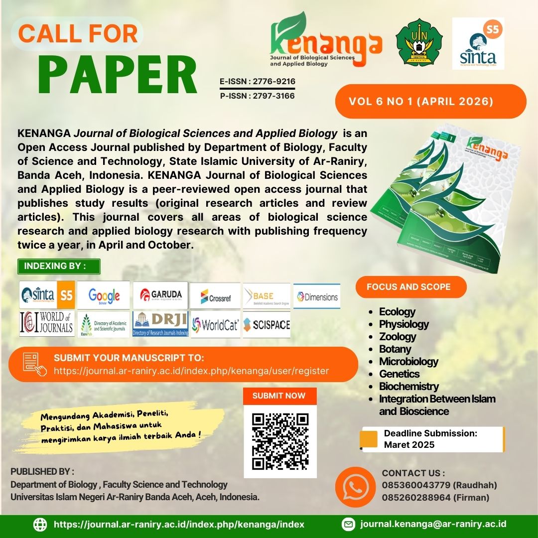 KENANGA :  Journal of Biological Sciences and Applied Biology (p-ISSN: 2797-3166, e-ISSN: 2776-9216) is an Open Access Journal published by Department of Biology, Faculty of Science and Technology, State Islamic University of Ar-Raniry, Banda Aceh, Indonesia. KENANGA Journal of Biological Sciences and Applied Biology is a peer-reviewed open access journal that publishes study results (original research articles and review articles). This journal covers all areas of biological science research and applied biology research with publishing frequency twice a year, in April and October