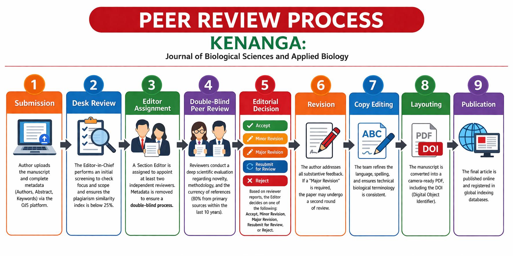 KENANGA: Journal of Biological Sciences and Applied Biology employs a double-blind peer review process, in which the identities of authors and reviewers are kept confidential until the article is published. Each research article is reviewed by at least two reviewers to evaluate its validity, quality, and originality. Accepted articles are published online in either English or Indonesian.