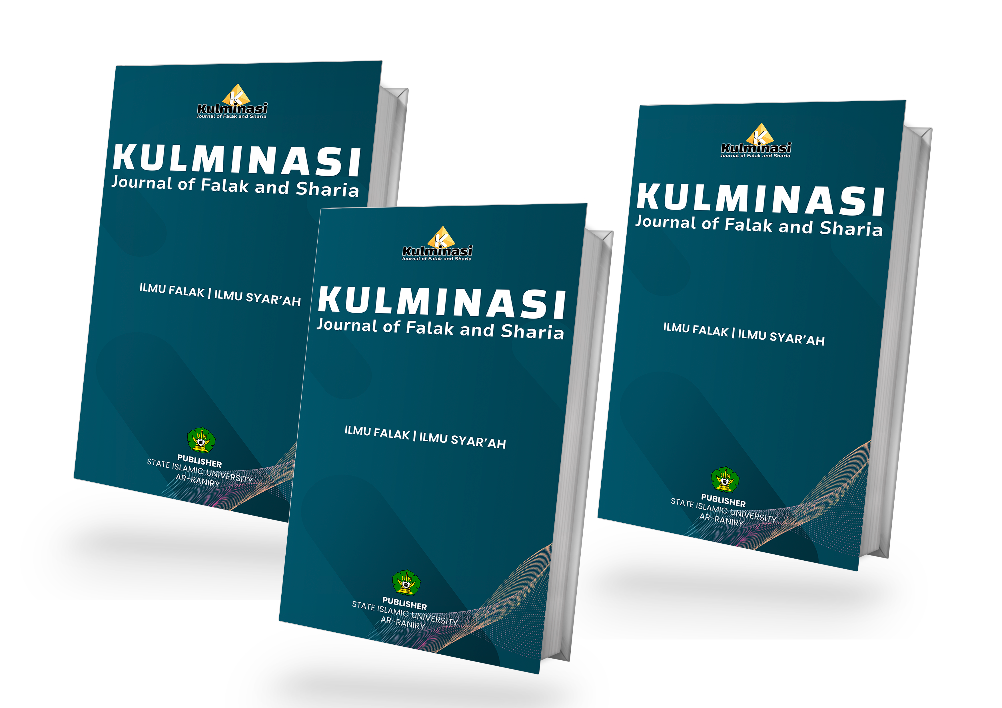 Editor in ChiefManaging Editor : Riadhus Sholihin, S.Sy., M.H Publisher : Universitas Islam Negeri Ar-Raniry Frequency: 2 Issues/Year (July and December)Citation AnalysisKulminasi; Journal of Falak and Sharia is a scientific journal published in July and December per year by the Falak Study Centre at the Faculty of Sharia and Law, Universitas Islam Negeri (UIN) Ar-Raniry, Banda colaboration with Pusat Studi Falak Ar-Raniry (PSF Ar-Raniry). Articles published in this journal are the results of empirical research in Falak (such as qibla, salat times, Islamic Calendar, Eclipse and others), Sharia (Fiqh and Ushul Fiqh, Al-Qur'an and Hadith, Islamic Law and others), and its approaching on other area studies (mathematics, physics, astrophysics, social, politics, anthropology, ethnography and others). This journal has specifications as a medium of publication and communication of Falak ideas derived from theoretical and analytical studies, as well as research results in the field of both natural and social science. The editor hopes that writers, researchers and legal experts will contribute in this journal.