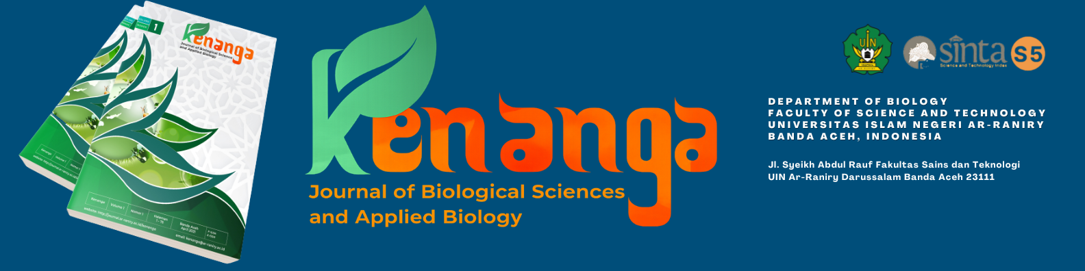 KENANGA : Journal of Biological Sciences and Applied Biology (p-ISSN: 2797-3166, e-ISSN: 2776-9216) is an Open Access Journal published by Department of Biology, Faculty of Science and Technology, State Islamic University of Ar-Raniry, Banda Aceh, Indonesia. KENANGA Journal of Biological Sciences and Applied Biology is a peer-reviewed open access journal that publishes study results (original research articles and review articles). This journal covers all areas of biological science research and applied biology research with publishing frequency twice a year, in April and October